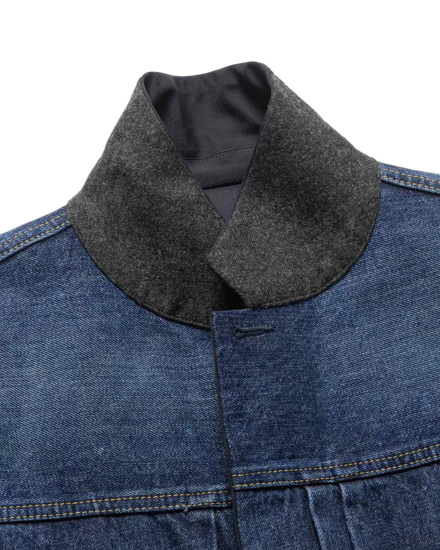 Utilising Their Signature Style Of Design Fusion, The Denim Blouson From Sacai Is A Hybrid Style Seamlessly Incorporating The Notch Lapel Of A Blazer Onto The Body Of A Classic Denim Trucker Jacket. Achieving A Layered Look Within One Piece. Constructed From A Soft, Textural Denim, That’S Been Given A Wash Treatment For A Broken In Look And Feel, And Finished With A Collar In An Elegant Suiting Fabric.